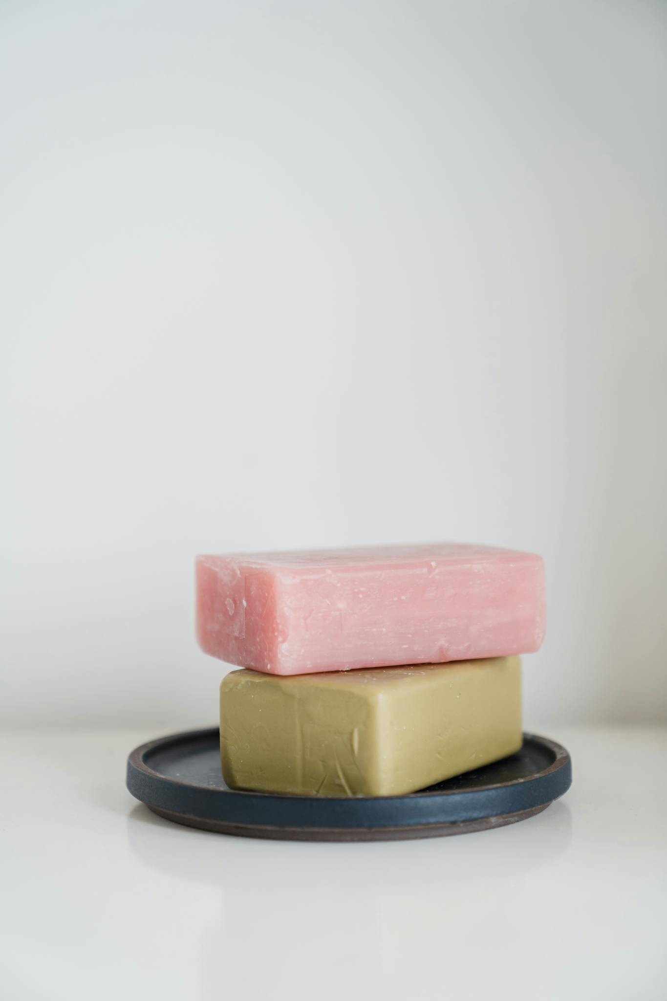 Two soap bars neatly stacked on a tray against a white background.